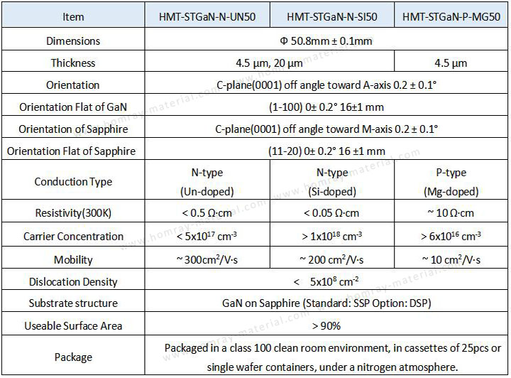 As the leading manufacturer and supplier of GaN (Gallium Nitride) substrate wafer, Homray Material Technology offers 2 inch and 4 inch 4.5um&20um thickness Sapphire GaN (Gallium Nitride) Template wafer (compoist substrate). Sapphire substrate can single side polished (SSP) or double side polished (DSP). GaN can be doped with silicon (Si) or with oxygen to n-type and with magnesium (Mg) to p-type. GaN is a very hard, mechanically stable wide bandgap semiconductor material with high heat capacity and thermal conductivity. In its pure form it resists cracking and can be deposited in thin film on sapphire or silicon carbide, despite the mismatch in their lattice constants.