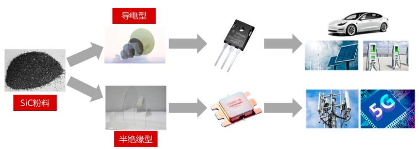 导电型衬底在功率器件中得到广泛应用,下游市场包括新能源汽车、光伏、高铁、工业电源等领域。导电型碳化硅衬底主要应用于制造功率器件,功率器件是电力电子行业的重要基础元器件之一,广泛应用于电力设备的电能转化和电路控制等领域,涉及经济与生活的方方面面。碳化硅功率器件以其优异的耐高压、耐高温、低损耗等性能,较好地契合功率器件的要求,因而在近年被快速推广应用,例如新能源汽车、光伏发电等领域。